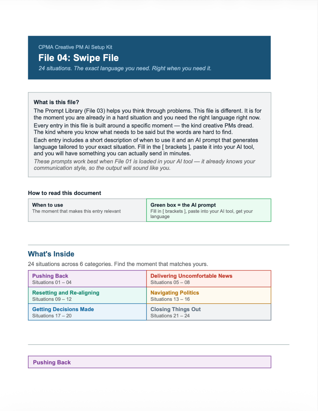 Pull from 28 ready-to-use prompts, a swipe file for hard conversations, and 7 working templates — built for the situations creative PMs face every day.