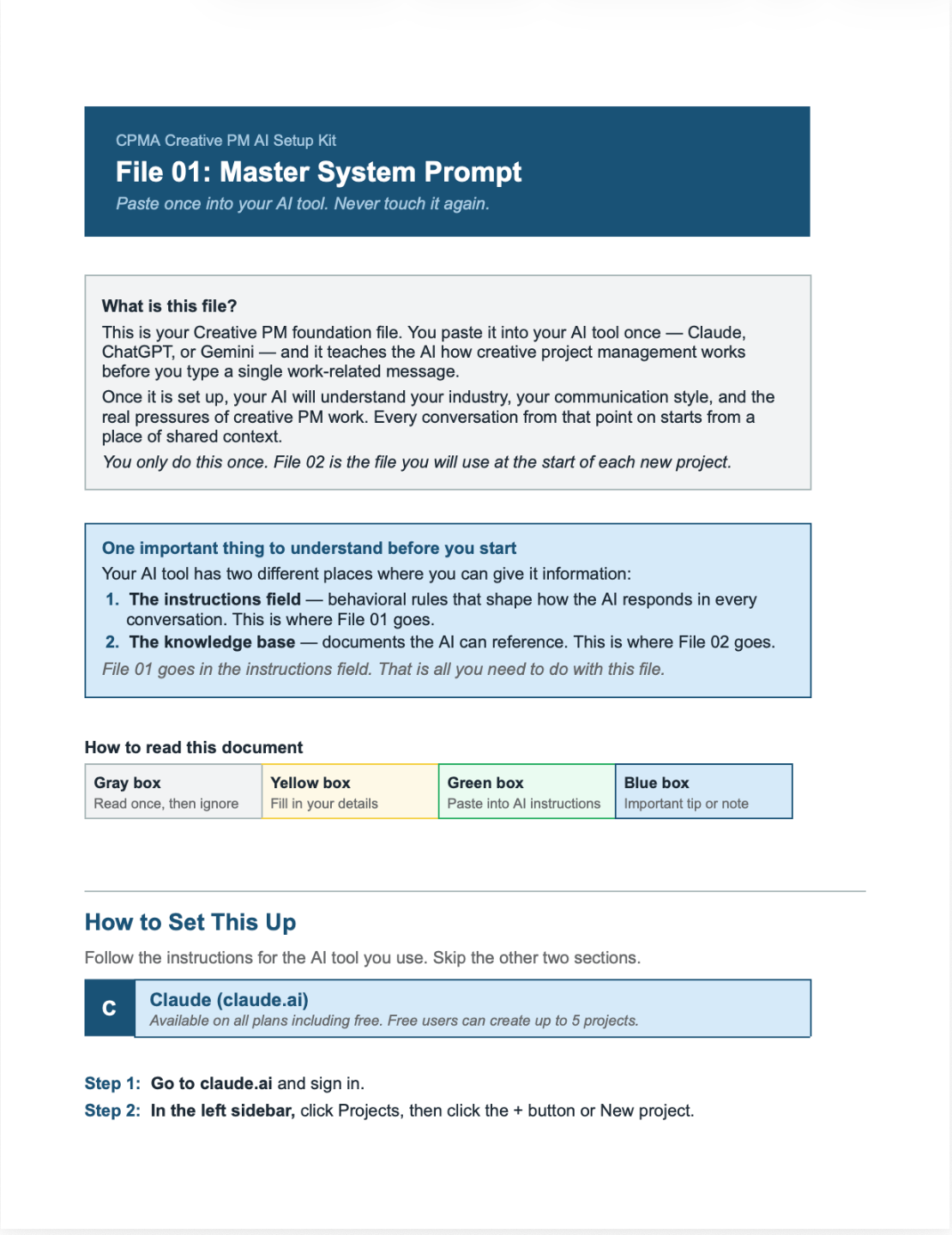 Paste the Master System Prompt into your AI project. It teaches your tool how creative PM work functions — your industry, workflow, and communication style.